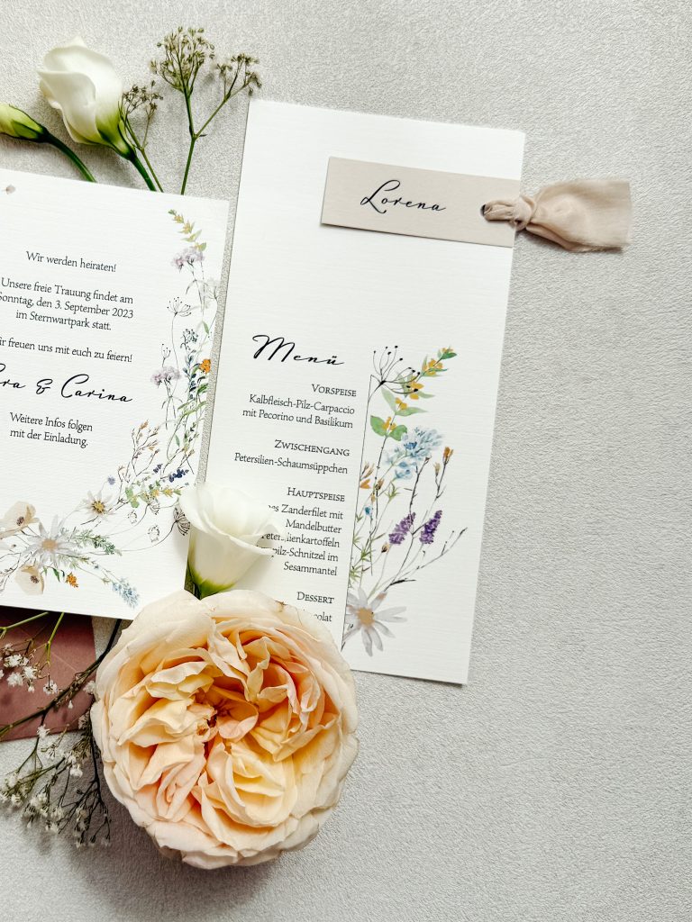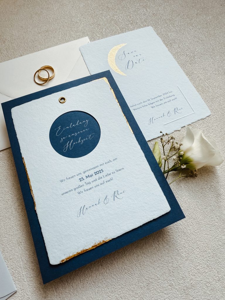 Das hängt von Umfang und Produkten ab – also zum Beispiel Einladungen, Menükarten oder Save-the-Date Karten – und auch von meiner aktuellen Auftragslage. Für Save-the-Dates oder Einladungen ist ein Vorlauf von etwa 12 Monaten vor eurer Hochzeit ideal. Für die Papeterie am Hochzeitstag reicht meist ein Zeitraum von etwa 3 Monaten vorher.