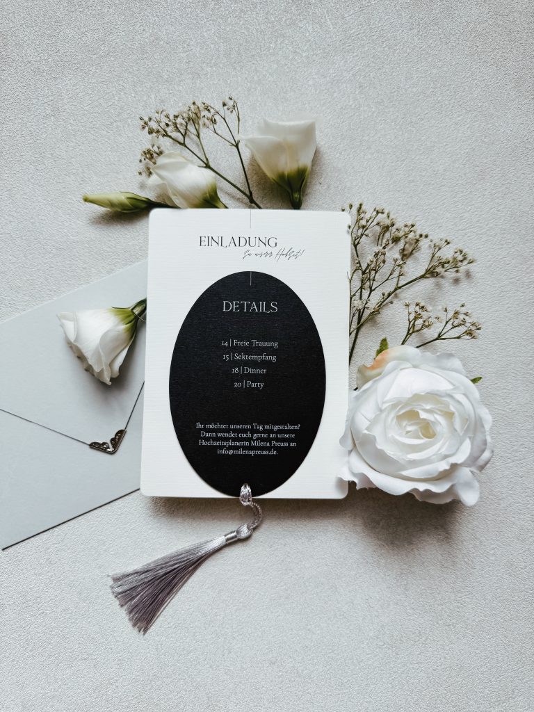 Die meisten Paare investieren zwischen 1.000 € und 2.000 € in ihre Hochzeitspapeterie. Pauschal lässt sich der Preis aber nicht festlegen, da viele Faktoren eine Rolle spielen – z. B. Papierstärke, Form der Karten, Bandmaterial oder besondere Veredelungen.